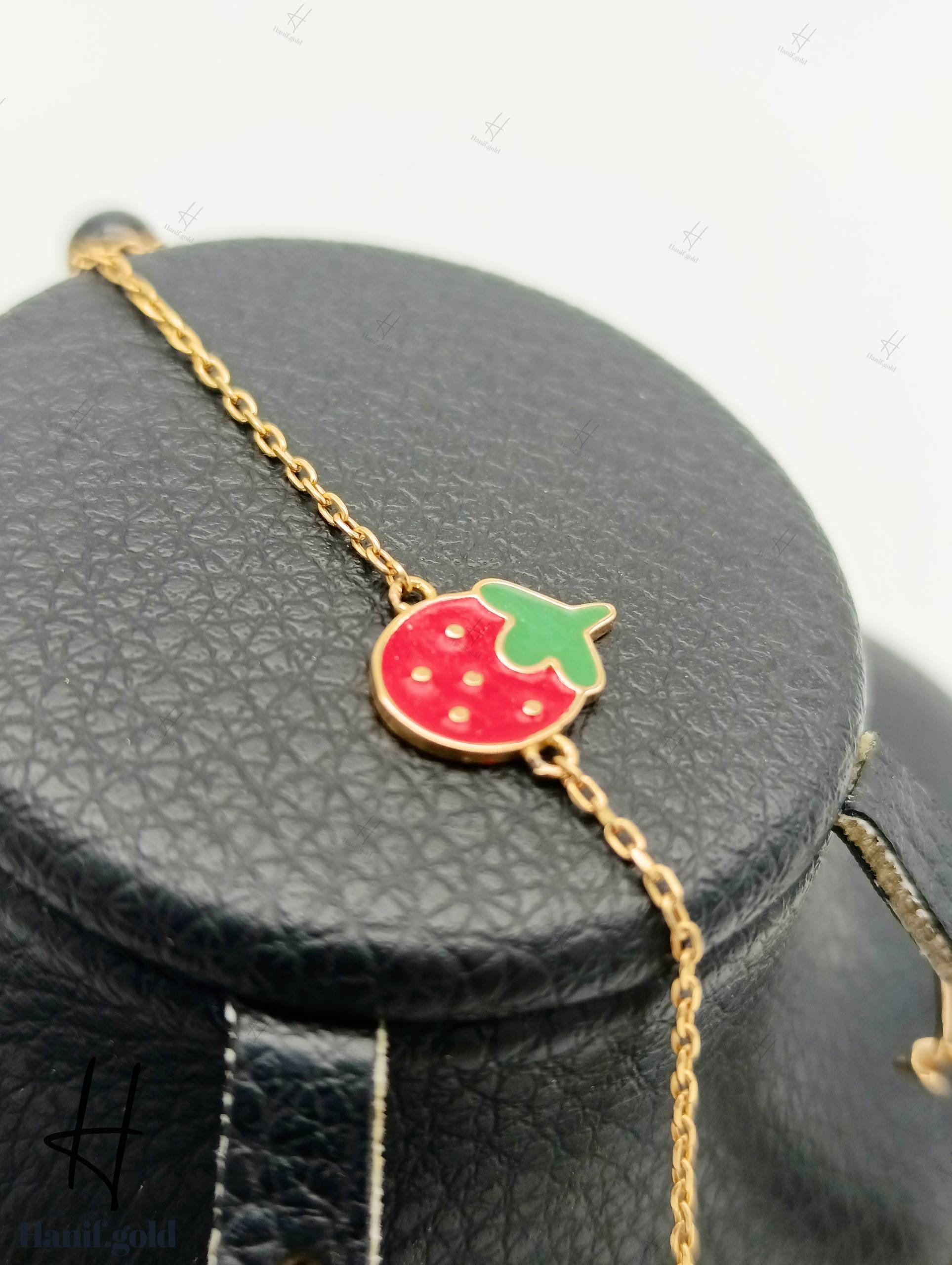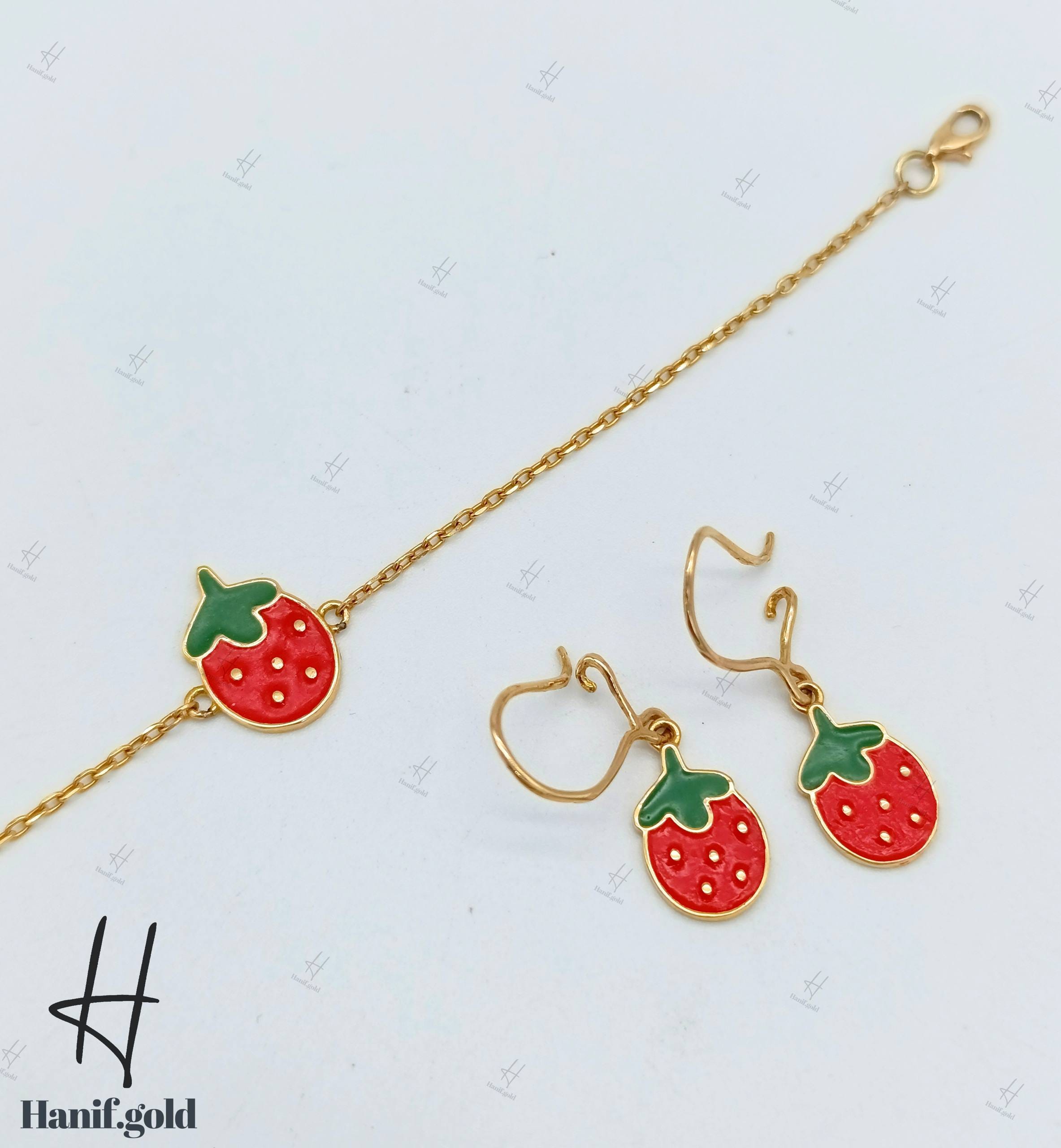 دستبند و گوشواره طلای بچهگانه با طرح توتفرنگی (مجموعه دلارام)
